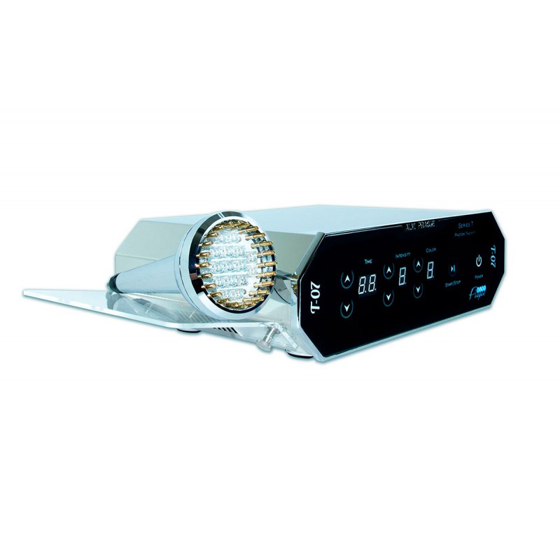 Il pannello frontale dela la lampada per fototerapia T-07 contiene solo un pulsante di accensione. Sul retro del manipolo è presente un'interfaccia a pulsanti per una regolazione più precisa. Oltre ai LED, che generano fasci di fotoni in sette diversi spettri di colore, il manipolo è dotato di elettrodi spot che forniscono un potente effetto elettroterapeutico generando deboli correnti.