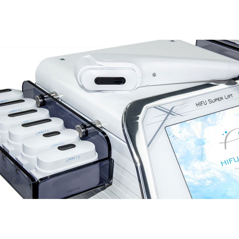 Il HIFU macchinario estetico Super-Lift mini 2 può essere utilizzato per ringiovanire qualsiasi zona del corpo e del viso. L'apparecchiatura consente di regolare la profondità di penetrazione degli ultrasuoni nel tessuto utilizzando sette cartucce HIFU.